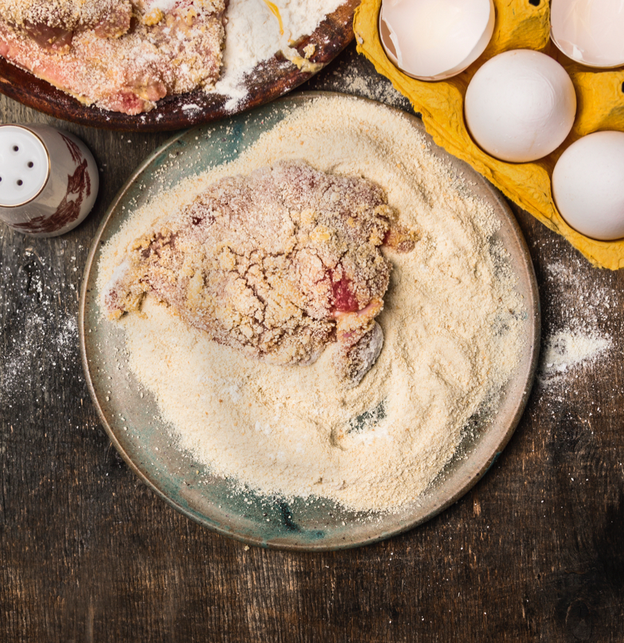 Het vlees moet goed plat zijn – vaak wordt het nog even plat gemept met een vleeshamer of een deegroller – en gaat daarna achtereenvolgens door bloem, losgeklopt ei en paneermeel. De bloem zorgt ervoor dat het ei blijft plakken, wat er weer voor zorgt dat het paneermeel blijft plakken.
