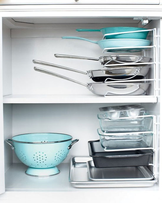 Snel je naar Ikea of Blokker, haal voor een paar euro zo’n rekje, trek al je pannen uit je keukenkastjes en het ordenen kan beginnen. Werkt nog rustgevend ook. Het resultaat: een opgeruimd keukenkastje én een opgeruimd hoofd. En dat voor een paar euro!