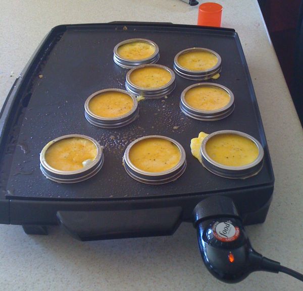 Gebruik de dekseltjes van kruidenpotjes! Deze van Fackelmann zijn daar bijvoorbeeld perfect voor. De vorm houdt de eitjes mooi rond; handig voor op een rond broodje of bagel. Na een paar minuten haal je de dekseltjes eraf en keer je de ei-rondjes om.