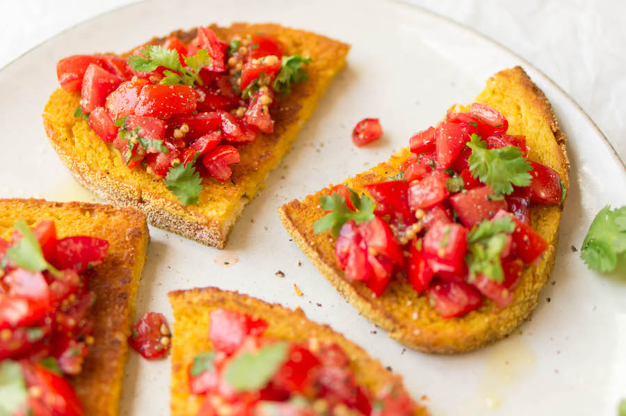 > Naar het recept: In kurkuma-boter gebakken toast met tomatensalade