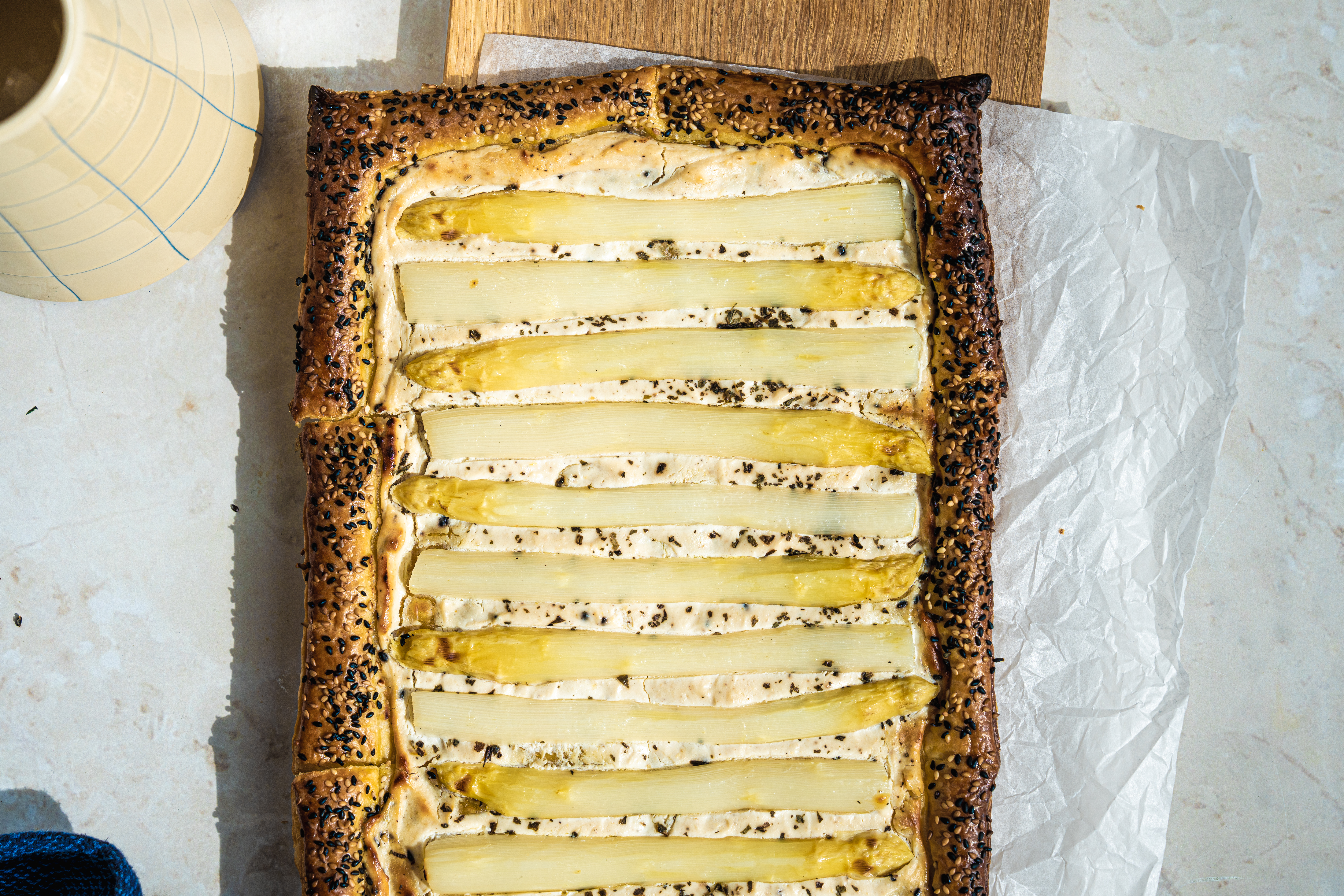 > Naar het recept: Plaattaart met witte asperges, ricotta en miso
