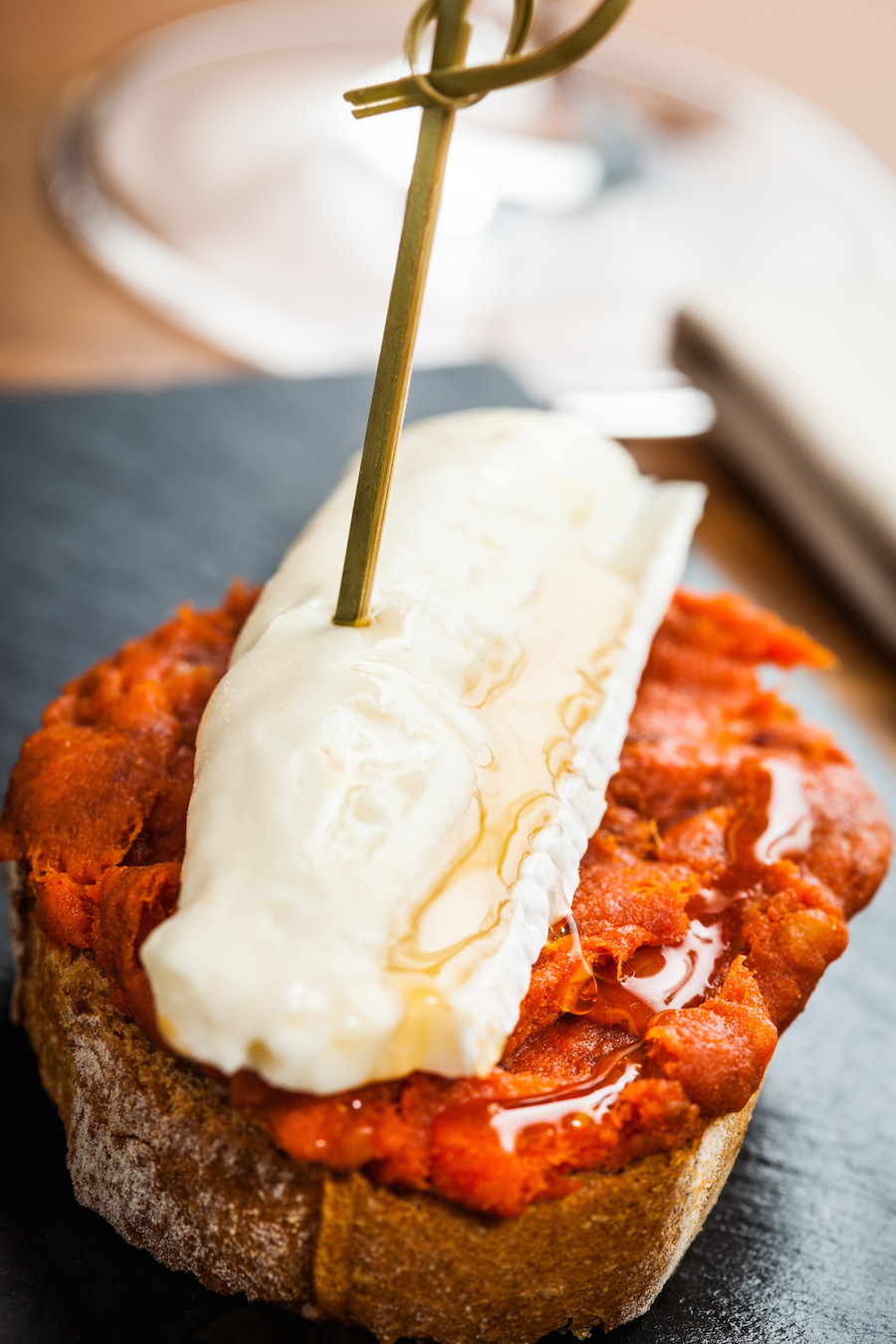 Maar je kunt ‘m ook omtoveren tot luxe tapa met een mooi stukje kaas erbovenop (Manchego of zelfs Brie), een groene olijf en wat olijfolie. Of met een gebakken kwarteleitje.