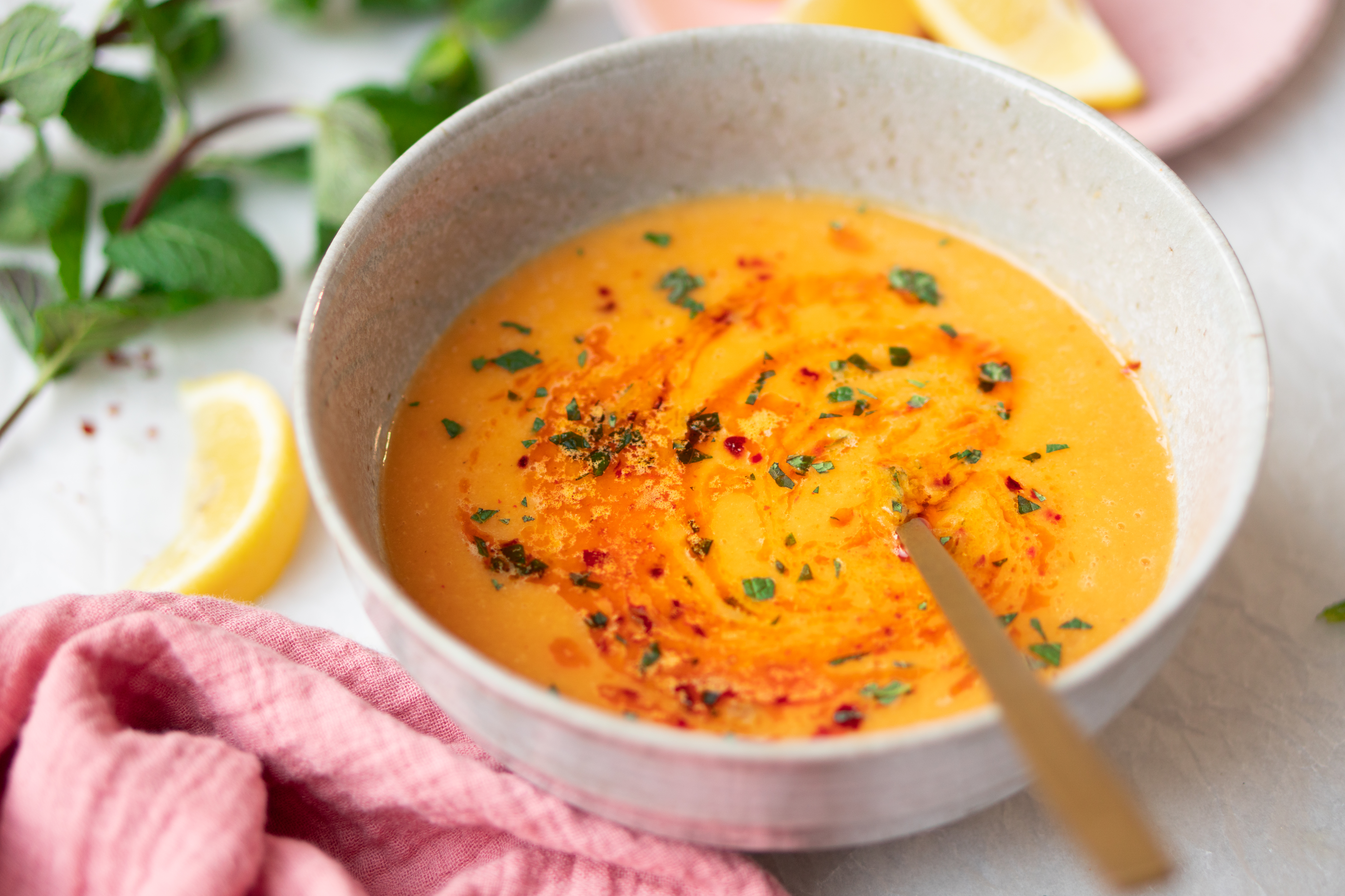 Warm jezelf op een koude avond aan deze soep en reis in gedachten naar een warm land. De smaakmakers in deze Turkse rode linzensoep zijn munt, citroen en pul biber: een Turkse variant van gedroogde chili. Deze grove chilivlokken zijn mild en hebben iets licht citrus-achtigs.