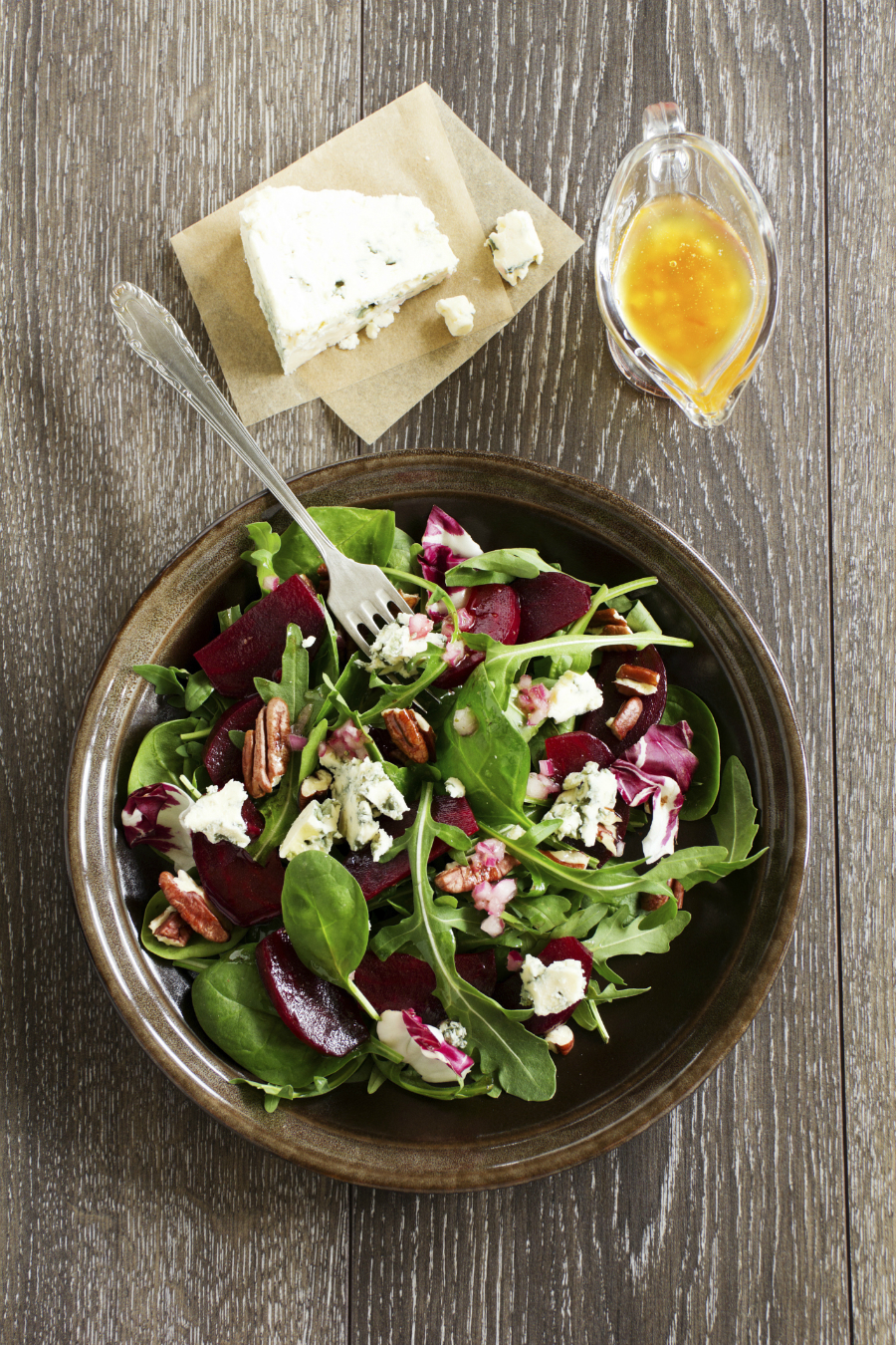 - Winterse salade met blauwe kaas, gebakken peer en walnoten