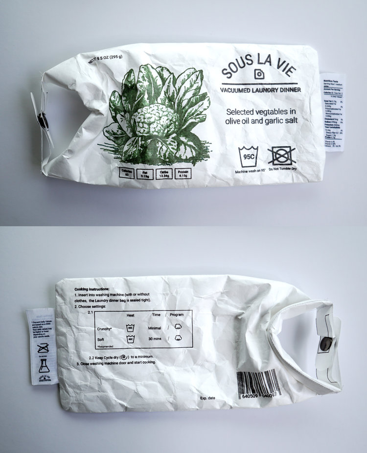 Zo ontstond zijn project: Sous La Vie. Hij ontwierp een soort waszakjes van tyvek: een synthetisch materiaal dat bestaat uit vezels van HDPE (hoge-dictheid-polyetheen). Wegwerpoveralls en laboratoriumjassen worden daar bijvoorbeeld van gemaakt.