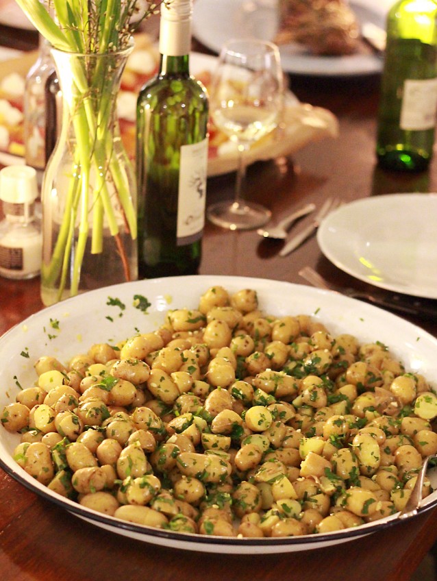 Samen met Monika stelde ik een menu samen. Brood en huisgemaakte kruidenboters vooraf, en daarna drie vega-, drie vis- en drie vleesgerechten. Ik wilde een relaxte sfeer, dus werden alle schalen tegelijkertijd op tafel gezet, zodat iedereen naar hartelust kon opscheppen. Daarnaast ziet zo’n tafel vol eten er geweldig uit!