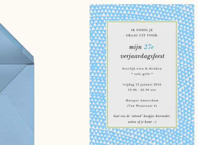 Het beste aan deze methode is dat je een RSVP-systeem aan de uitnodiging hangt; een knop waarmee mensen direct kunnen laten weten of ze wel of niet komen. Jij krijgt in het systeem te zien wie er komt, en je kunt je gasten een privébericht sturen, of een reminder naar alle genodigden sturen. Het werkt ideaal én het ziet er verzorgd uit.