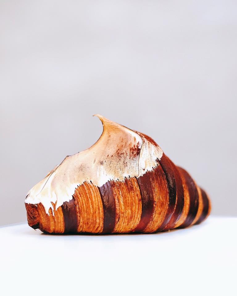Waar moet je dan aan denken? Bijvoorbeeld aan een Ferrero Rocher-croissant, gevuld met hazelnotenpraliné en ganache van pure chocolade, gedoopt in meringue, gebrand met een brûlee-brander en afgemaakt met cacao. Of wat dacht je van een roze lychee-bessen croissant of een exemplaar met frambozen en witte chocolade, afgemaakt met chocoladeschotsen erbovenop?