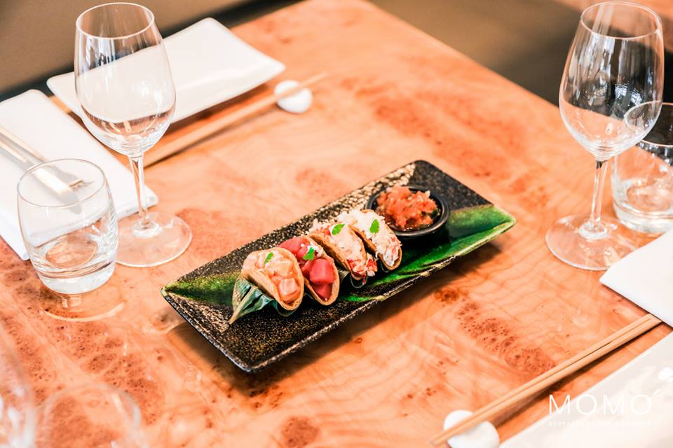 Restaurant MOMO in Amsterdam lijkt gelukkig wél knapperige taco’s te serveren: hun taco’s zijn mooi klein (lekker bite-size dus) en gevuld met sashimi van kreeft, zalm, tonijn en koningskrab.