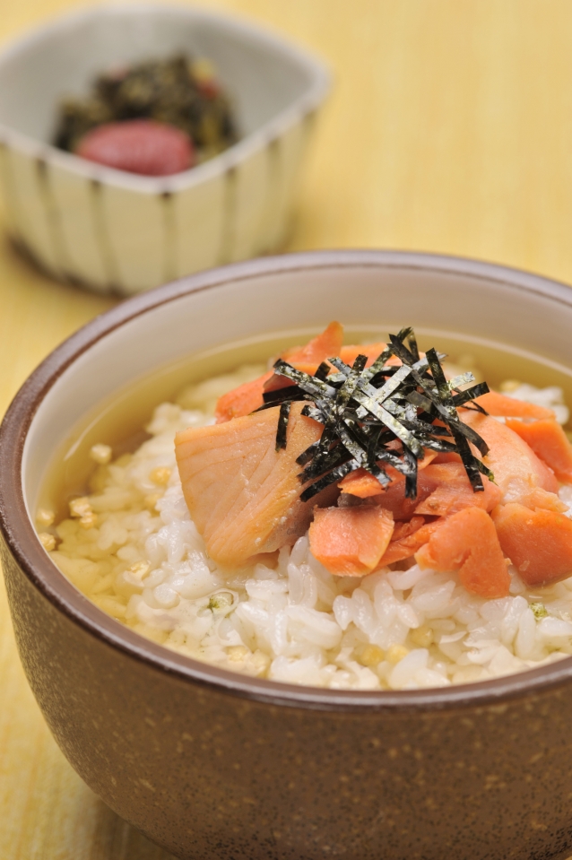 Een klassiek Japans gerecht is ochazuke waarbij er groene thee over Japanse rijst wordt gegoten om een soort soep te creëren. Vaak in combinatie met zalm, maar er zijn ook vega versies.