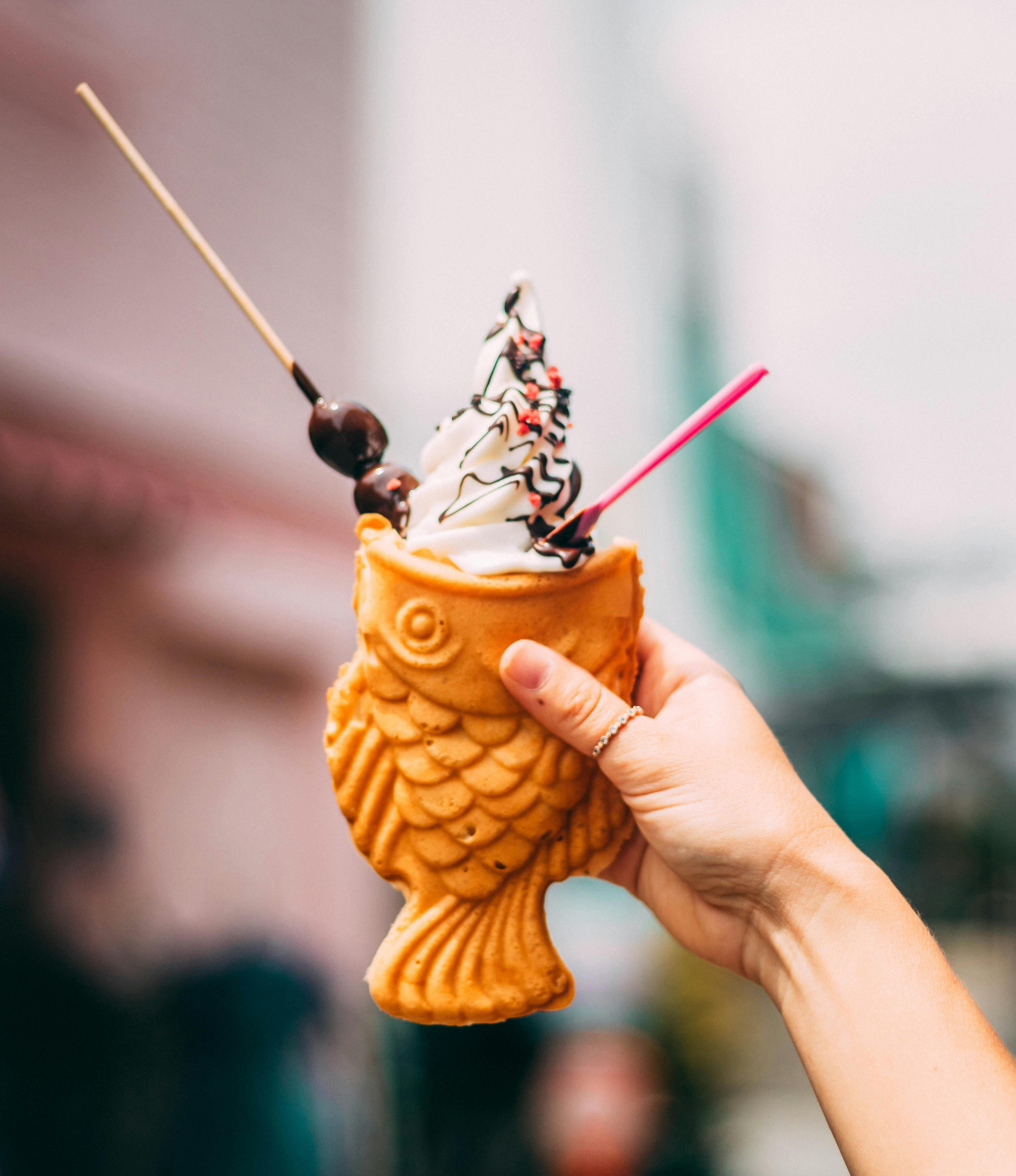 En dan heb je nog de ijsvariant: een taiyaki-hoorntje gevuld met softijs en toppings waar een gemiddelde freakshake uit 2016 jaloers op zou zijn. Taiyaki is dus niet alleen héérlijk, maar ook veelzijdig met veel varianten, en ziet er superleuk uit voor de socials!