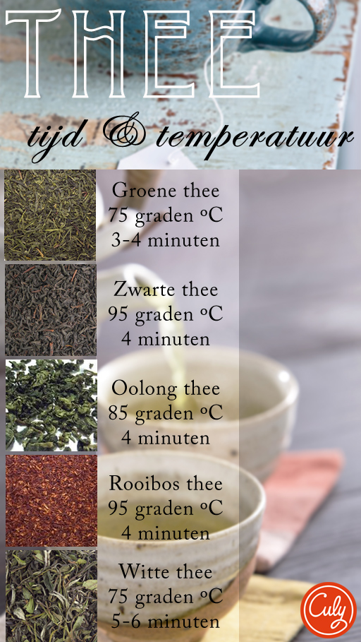 De ene culy is fan van zwarte thee, de ander gek op rooibos. Maar elke thee moet anders ‘behandeld’ worden; de één moet langer trekken dan de ander, en sommige theesoorten gedijen beter bij een lagere temperatuur van het water. Bijvoorbeeld groene thee; die wordt al snel bitter bij kokend water.