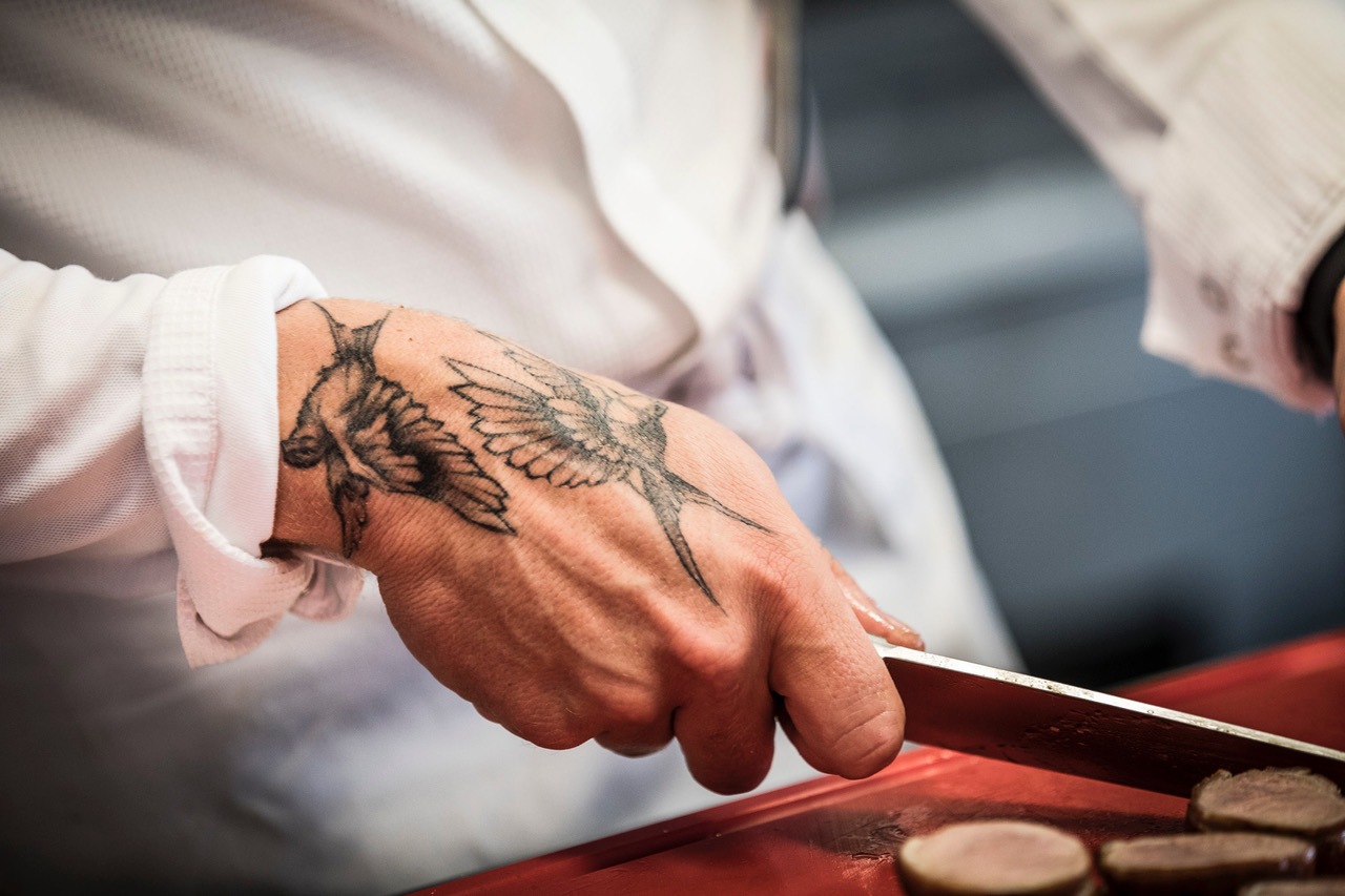 Op mijn handen: vogels. Vrijheid. Ten eerste vind ik het gewoon mooi. Toen ik voor mezelf ging werken, heb ik ze laten zetten, dus het vertegenwoordigt zeker een bepaalde vrijheid en onafhankelijkheid. Ik heb nog veel meer tatoeages, op mijn voeten, borst, armen. Ja: een verslaving. Maar de vogels op mijn handen zijn wel favoriet.