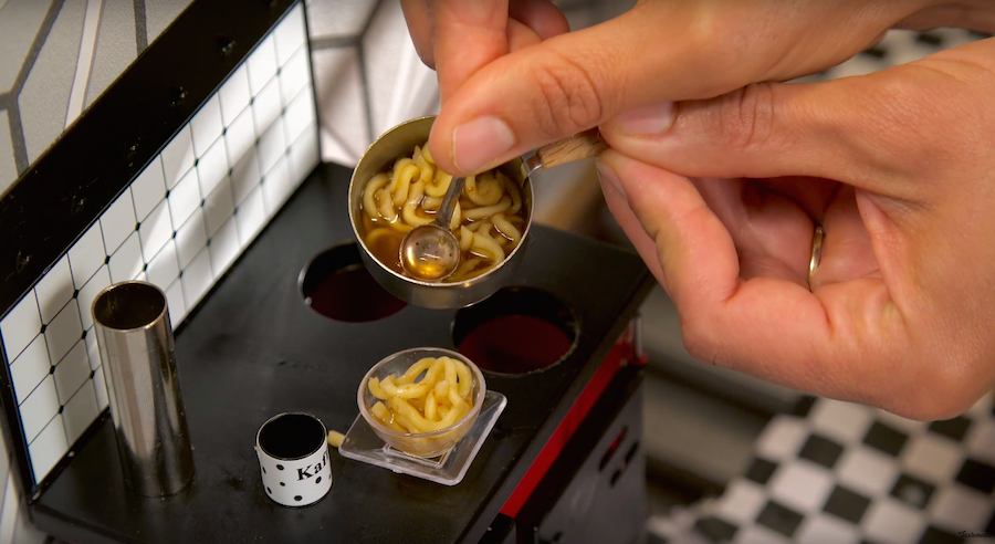 Het heeft iets uitermate rustgevends om iemand met uiterste precisie zulke kleine maaltijden te zien bereiden. Met een mini lepeltje wordt geroerd in mini pannetjes en kommetjes, met een mini mesje worden ingrediënten tot miniatuurformaat gesneden en op ’s werelds kleinste rasp wordt kaas geraspt tot mini sliertjes.