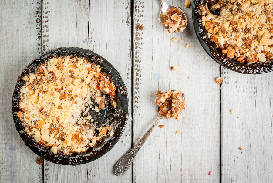 Wat je voor een hartige streusel moet doen, is een twist geven aan elk van de ingrediënten. Vervang de bloem bijvoorbeeld door broodkruim, fijngemalen chips of stukjes cracker. In plaats van suiker kun je bruine (of kokosbloesem-)suiker toevoegen, die is net iets hartiger van smaak. Of vervang ‘m door ahornsiroop of honing.