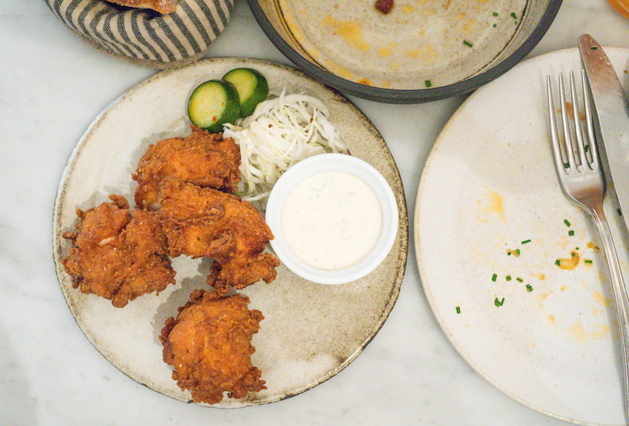 J. Kenji López-Alt heeft nog een tip, geleend van Chick-fil-A: een populaire keten in fried chicken in het zuiden van Amerika. Als je drie eetlepels van de karnemelk-marinade toevoegt aan de droge bloem-coating en die met je vingers door de bloem kneedt, krijg je extra knapperige stukjes beslag op je kip.
