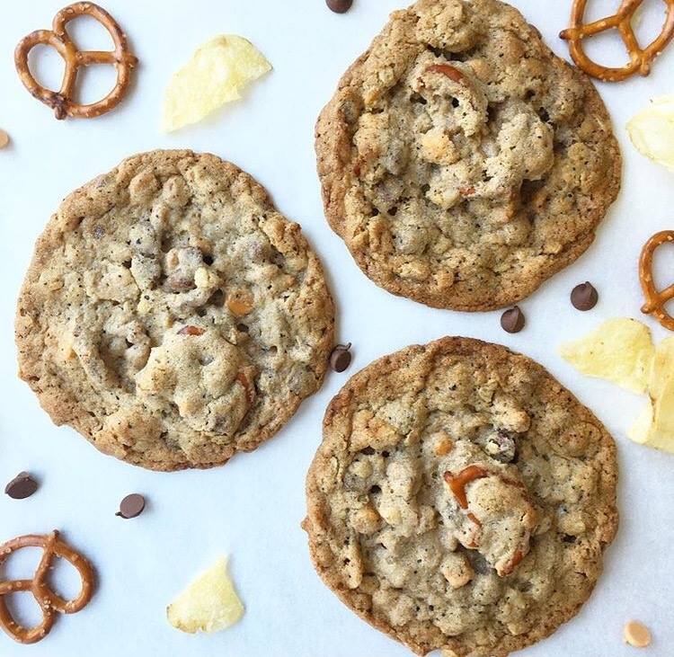Compost cookies zijn chocolate chip cookies, met mini pretzels, butterscotch, havermout, gemalen koffie, mini marshmallows én chips. Probeer het eens: de chips geven een lekkere crunch en wat zoutigs aan het koekje.