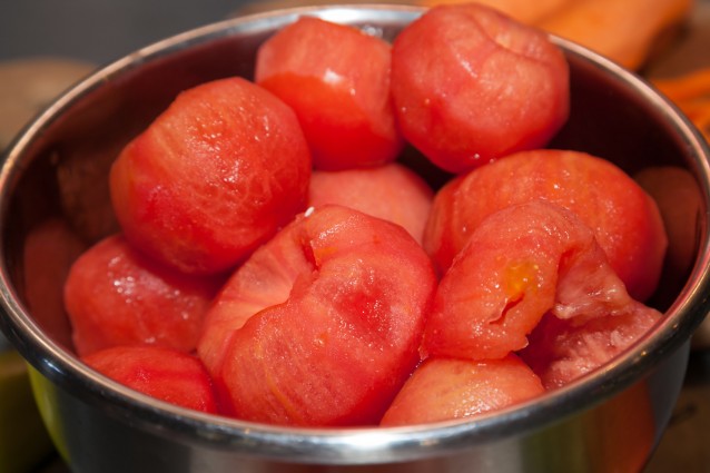 Leg de tomaten in het kokende water en haal ze na ongeveer een minuut eruit en leg met een draadspaan in het ijswater. Laat afkoelen en je haalt zonder enige moeite de velletjes eraf. Het enige nadeel: je moet hierbij in porties werken omdat de tomaten anders te lang koken.