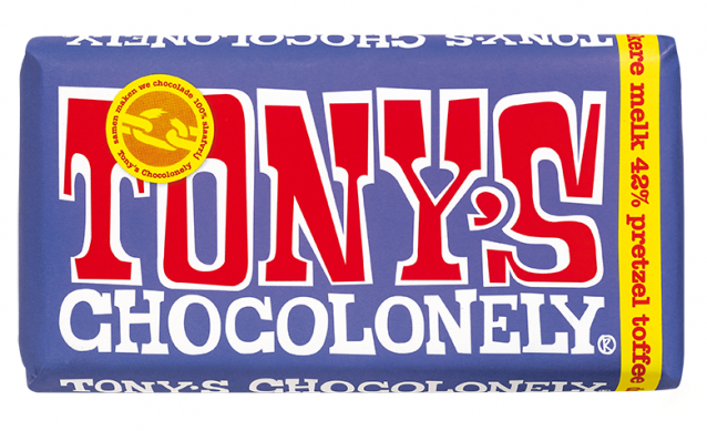 Donkere melk 42% pretzel toffee is vanaf vandaag verkrijgbaar bij Bijenkorf, Marqt, Wereldwinkels, WAAR!, Jamin, cadeau- en delicatessenzaken, natuurlijk Tony’s store en webshop én vanaf 28 augustus ook bij Albert Heijn.