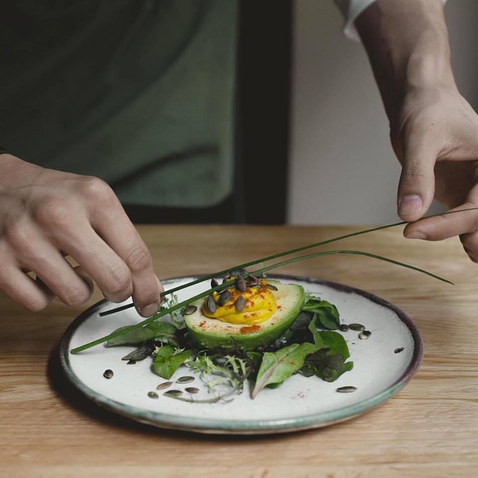 Dat levert een vegan gerecht op met een rijke smaak. Bij Le Potager de Charlotte vullen ze hun deviled avocado met een zelfgemaakte, gele hummus met kurkuma. Daarop gaat een vinaigrette, wat sla en kiemgroenten, knapperige pompoenpitten en een snufje paprikapoeder. Maak ‘m zelf na met zelfgemaakte of lekkere kant-en-klare hummus.