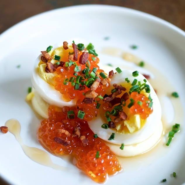 Chef Alvin Cailan die je kent van Eggslut in Los Angeles, opende onlangs een restaurant in New York: The Usual. Hier serveert hij luxe gevulde eieren met ‘crab louie’ (krabsalade), knapperige gefruite uitjes en flinterdunne strengen Japanse chili. Kosten? 15 dollar voor drie stuks. Of eigenlijk voor 1,5 ei dus eigenlijk. Dat zijn dus met recht luxe gevulde eieren te noemen!