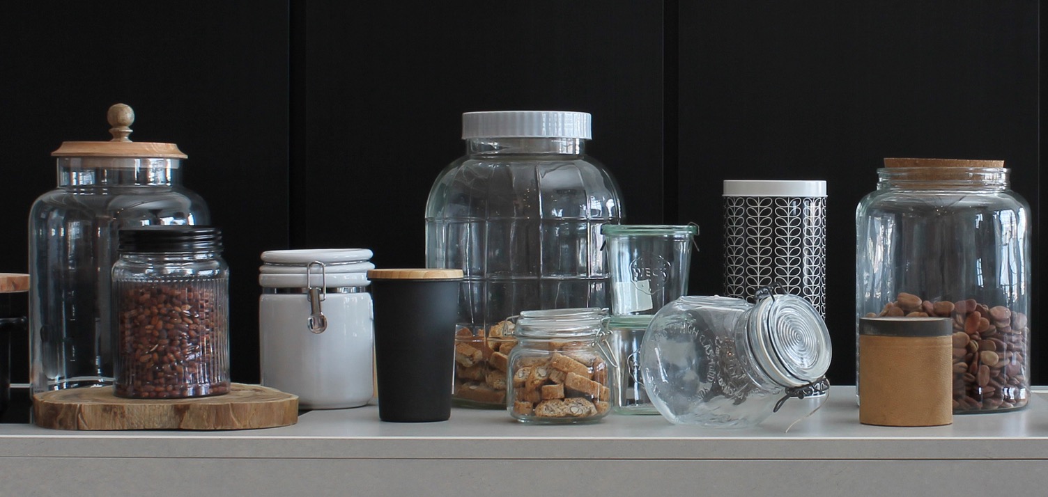 20. Voorraadpotten in allerlei soorten, stijlen en groottes op het aanrecht