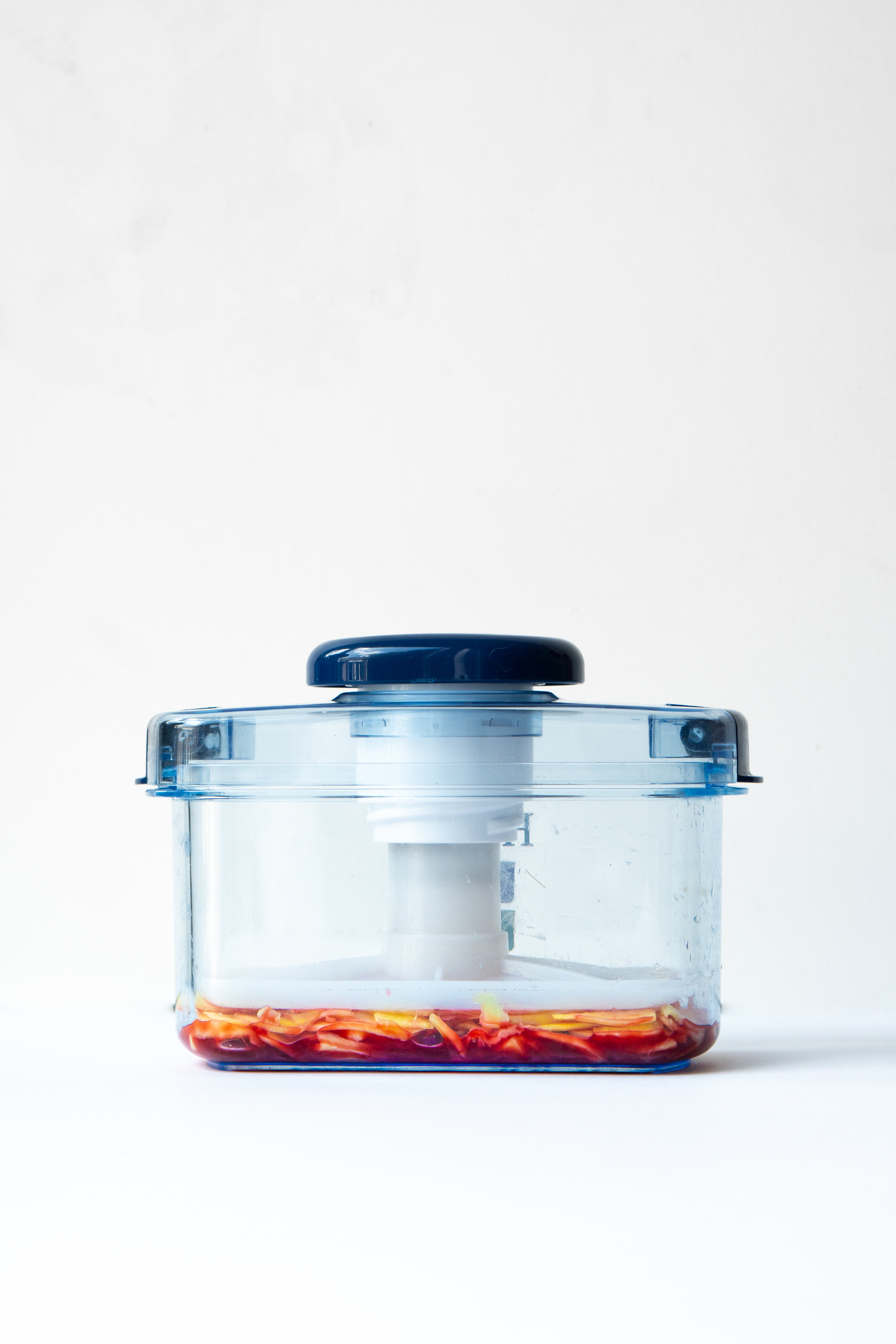 En dan proeven. We merken dat de smaak van de groenten intenser is geworden dan wanneer je ze op een andere manier zou picklen, wat te verklaren is door de druk die de pickle-pers toevoegt. Het levert heerlijke knapperige groenten op, met een frisse ziltheid.