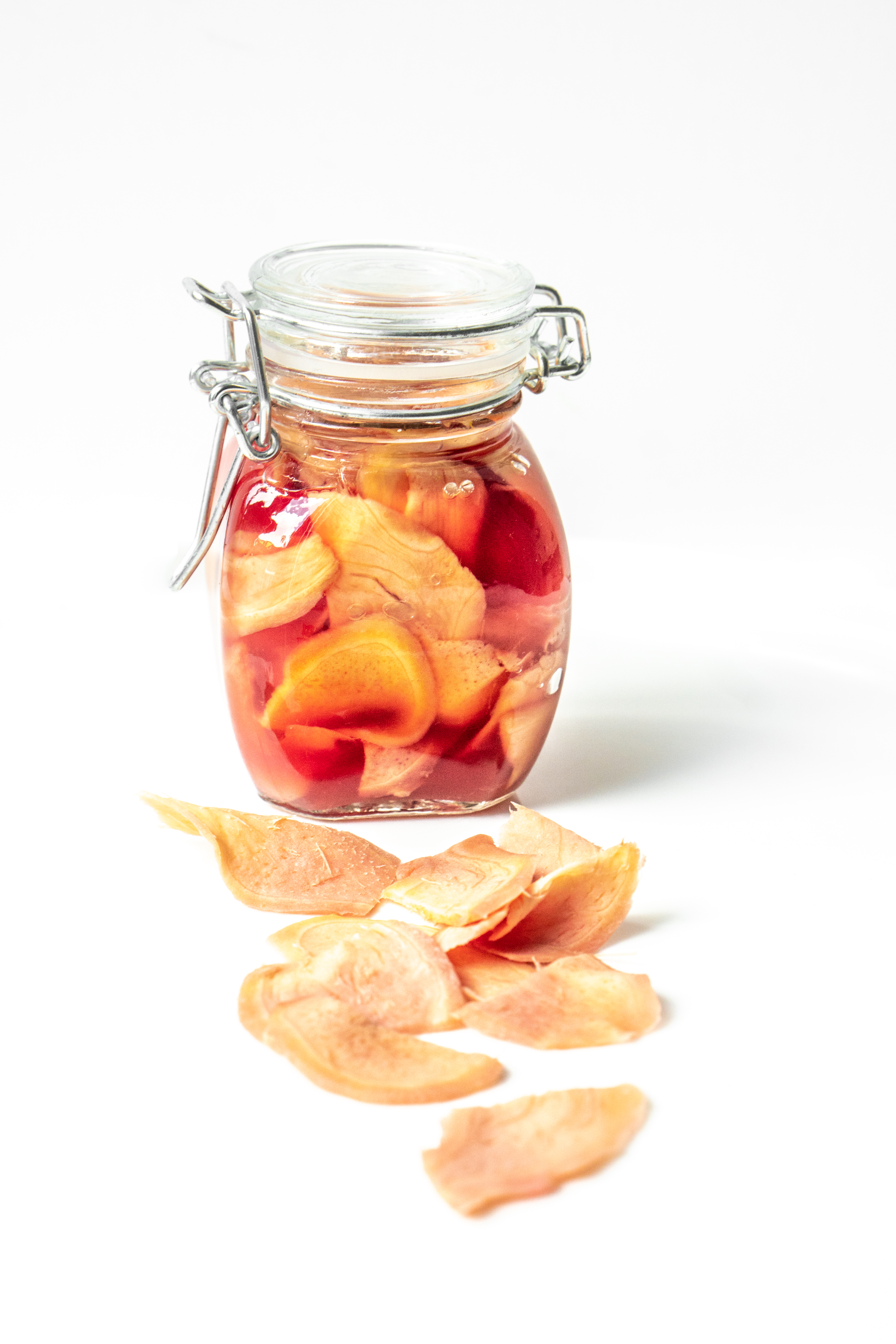 De gember gaat in de pickle-pers met zout, rijstazijn en zoet: Peter schrijft in zijn boek ‘oerzoet’ voor: ongeraffineerde en onbewerkte suiker. We voegen zelf nog wat bietensap toe om de sushi-gember zo’n funky roze kleurtje te geven. Na een uur zijn de pickles in principe al klaar (het roze kleurtje komt pas wat later). Deze pickles zijn 6 tot 12 maanden houdbaar in de koelkast. Tel uit je winst. Dit gaan we vaker doen!