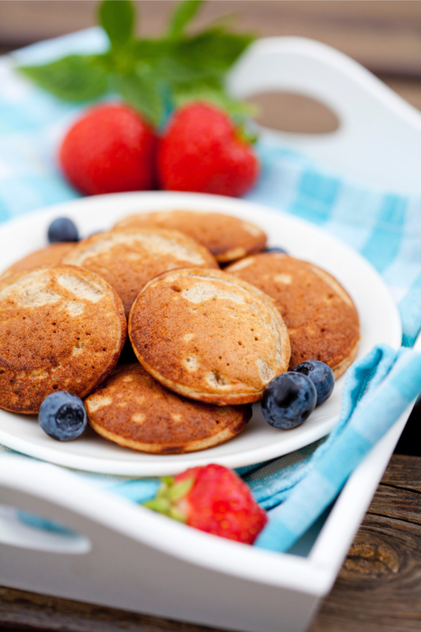 Hoef je niet helemaal glutenvrij te eten, maar wil je wel een gezonde twist aan je poffertjes geven? Dan kan je er ook voor kiezen om het tarwebloem – gedeeltelijk – door speltmeel of boekweitmeel te vervangen. Lekker om te serveren met honing en blauwe bessen.