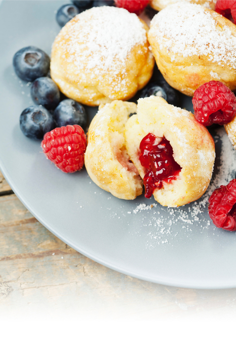 Waar ons hart sneller van gaat kloppen is de Deense variant. Dit poffertje wordt gevuld met jam, appelcompote of bijvoorbeeld chocolade. Lekker!