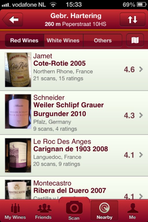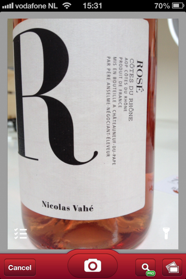 Wanneer je de app opent zijn er een aantal functies die je kunt gebruiken, waaronder een overzicht van de door jou gescande wijnen en mensen in de buurt die de app hebben gebruikt. Wil je aan de slag? Kies dan voor de button ‘scan’ en maak met je camera een foto. Is ‘ie goed gelukt? Dan zet je de app met een druk op de knop aan het werk en een paar seconden later zie je het resultaat.