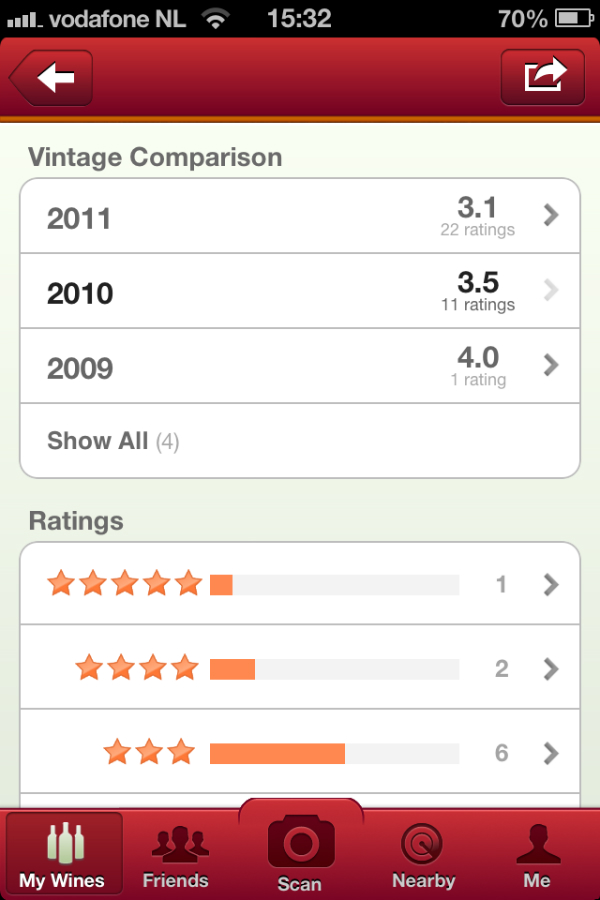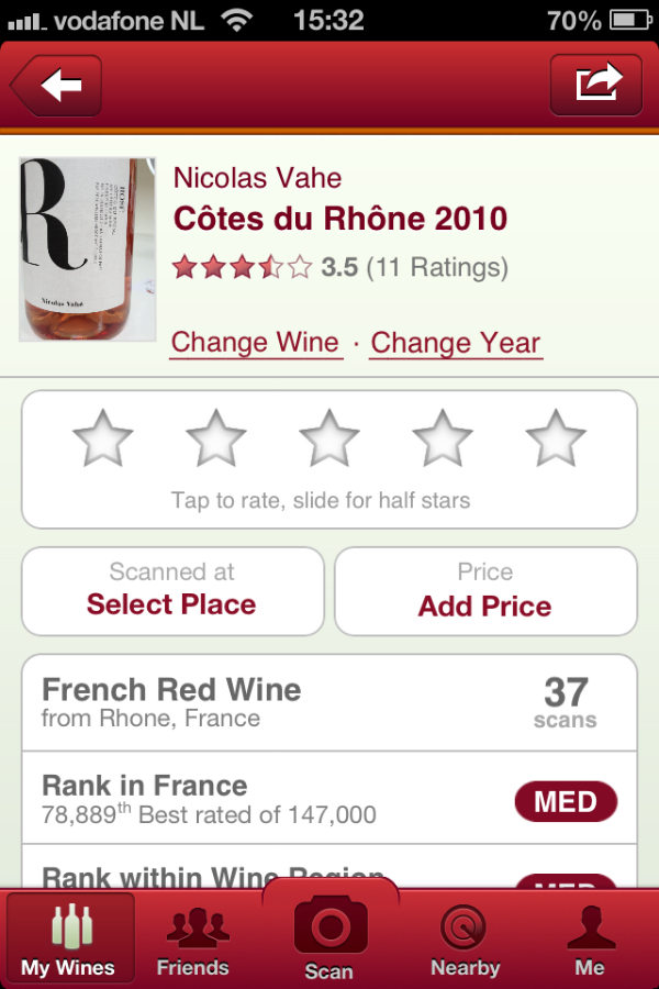 Allereerst kun je na het scannen zelf aangeven wat je van de wijn vond aan de hand van een vijf-sterrensysteem, waar je hem hebt gescand en hoeveel hij heeft gekost. Daarnaast zie je precies uit welke streek hij komt, hoe hij scoort in die regio, het land van herkomst, wereldwijd en zelfs binnen het wijnhuis.