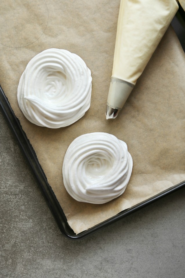 Je kunt ervoor kiezen om alle meringue in één keer op een met bakpapier beklede bakplaat te storten, in kleinere hoopjes of in precieze vormpjes. Gebruik eventueel een lepel, spatel of paletmesje om mooie pieken te creëren.