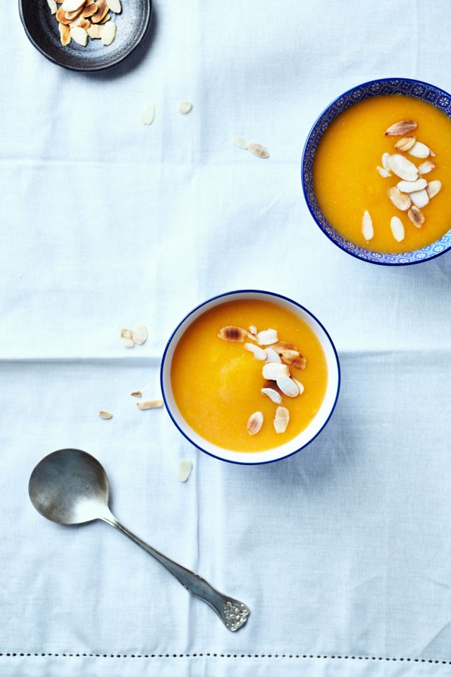 Zin in een snel soepje? Pureer de geroosterde pompoen met kippenbouillon en garneer eventueel met grof gehakte kruiden en een lepel crème fraîche.