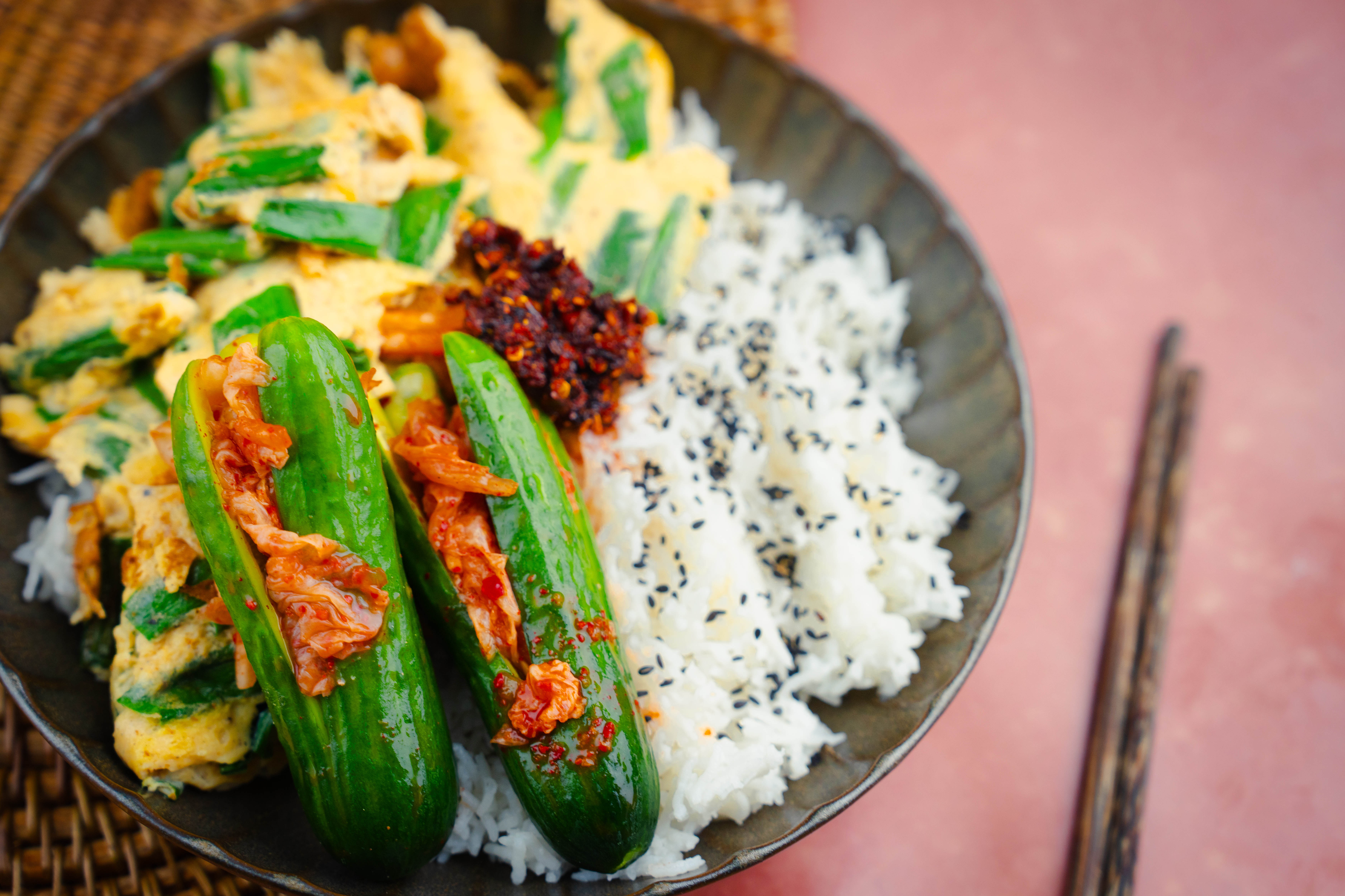 Deze niratama donburi (een Japanse rijstbowl met omelet) staat in een handomdraai op tafel en laat zien dat Japans eten helemaal niet ingewikkeld hoeft te zijn. Daarbij serveren we snelle gevulde mini-komkommers voor een frisse, knapperige touch. Zo houd je doordeweeks tijd over, zonder in te leveren op smaak of variatie.