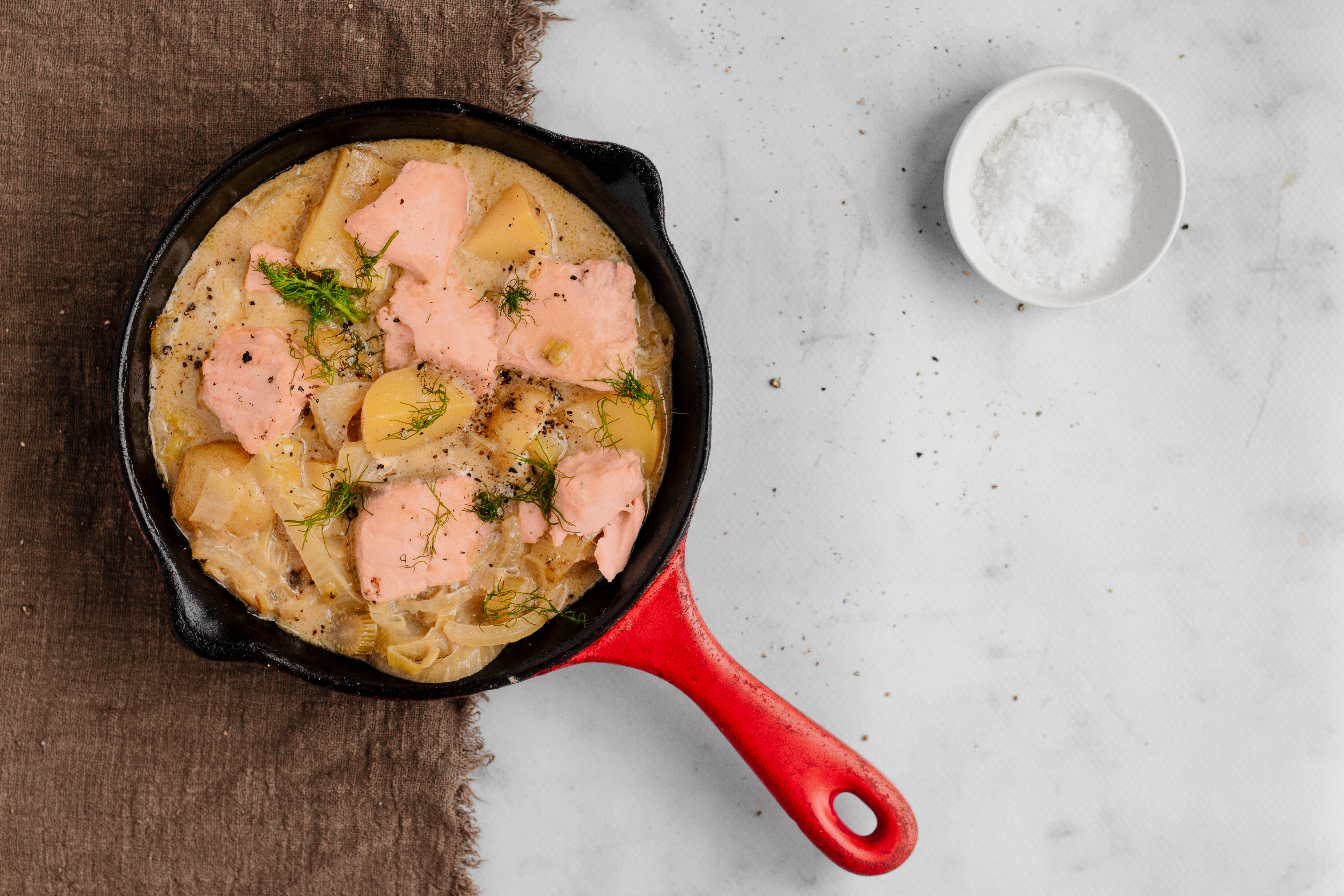 > Naar recept: eenvoudig vispannetje met zalm, venkel en witte wijn