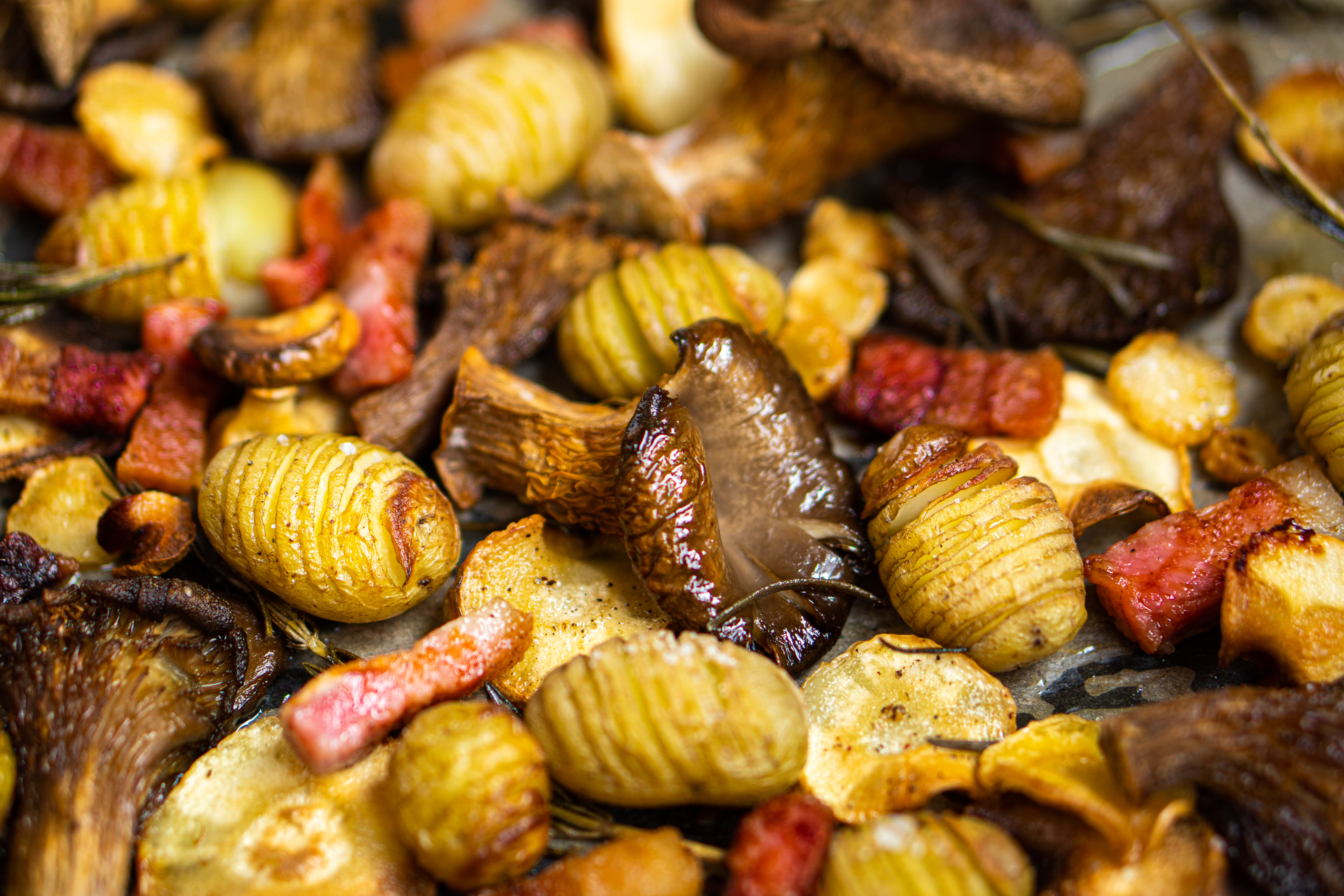> Naar recept: Culy Homemade: herfstige traybake met krieltjes, spek, pastinaak en oesterzwam