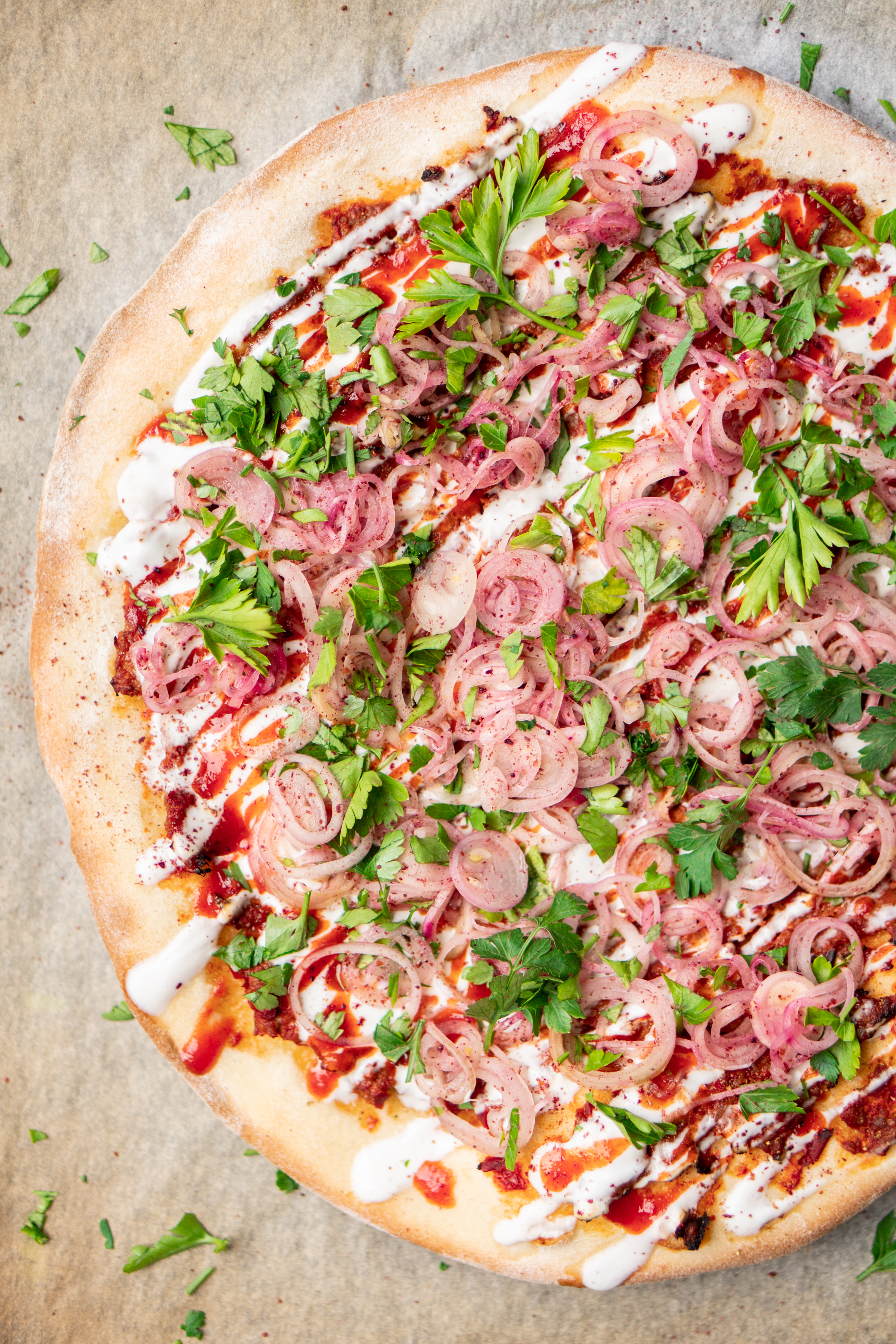 Deze ‘Turkse’ pizza is uiterst geschikt voor als je jezelf even goed wil verwennen, perfect op vrijdagavond. Zie ‘m als een verfijnde versie van de Turkse pizza die je als streetfood koopt. Op een knapperige Italiaanse pizzabodem, met een lading sumak-uien en verse peterselie.
