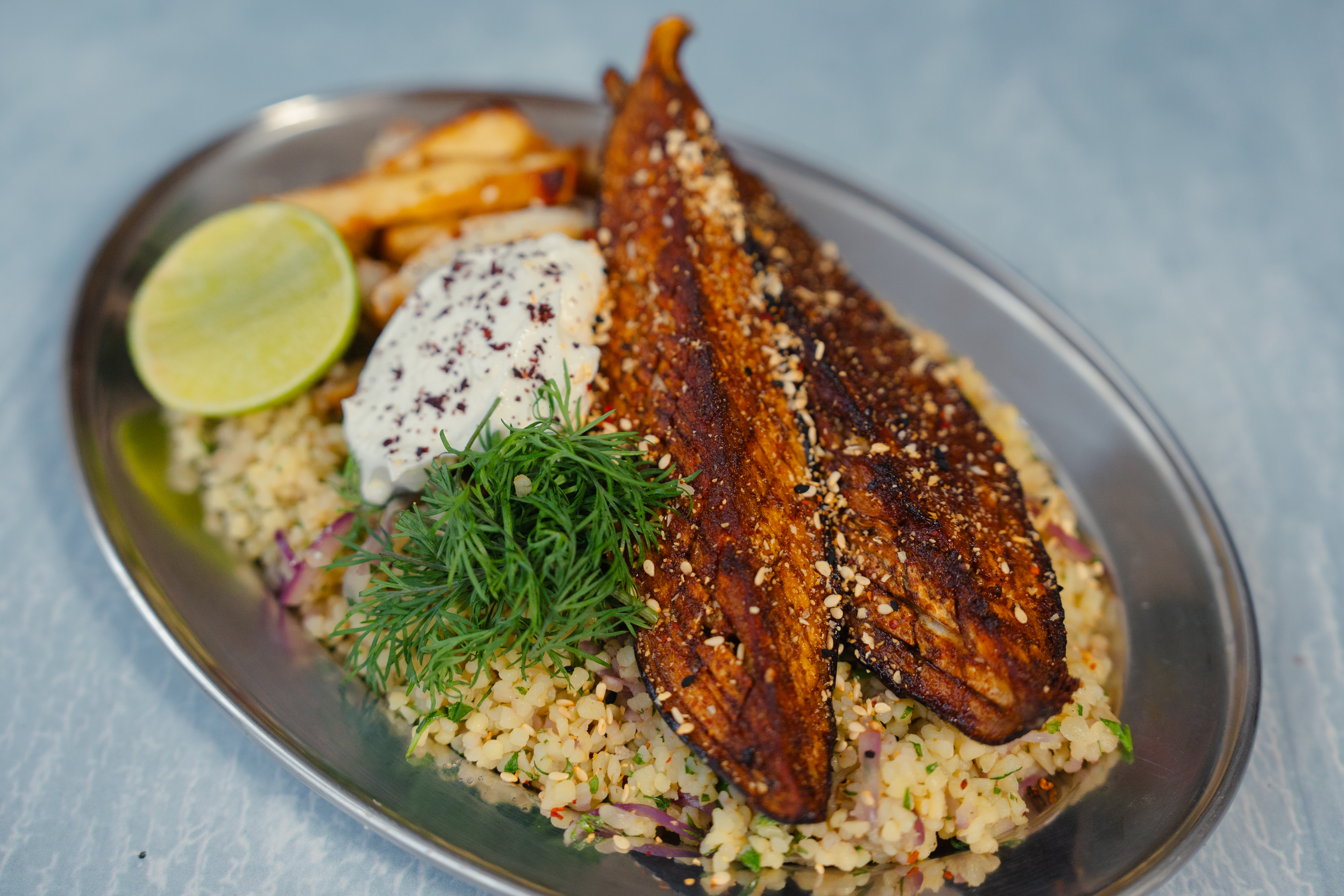 > Naar het recept: Bulgur-bowl met sticky halloumi en kruidige aubergine