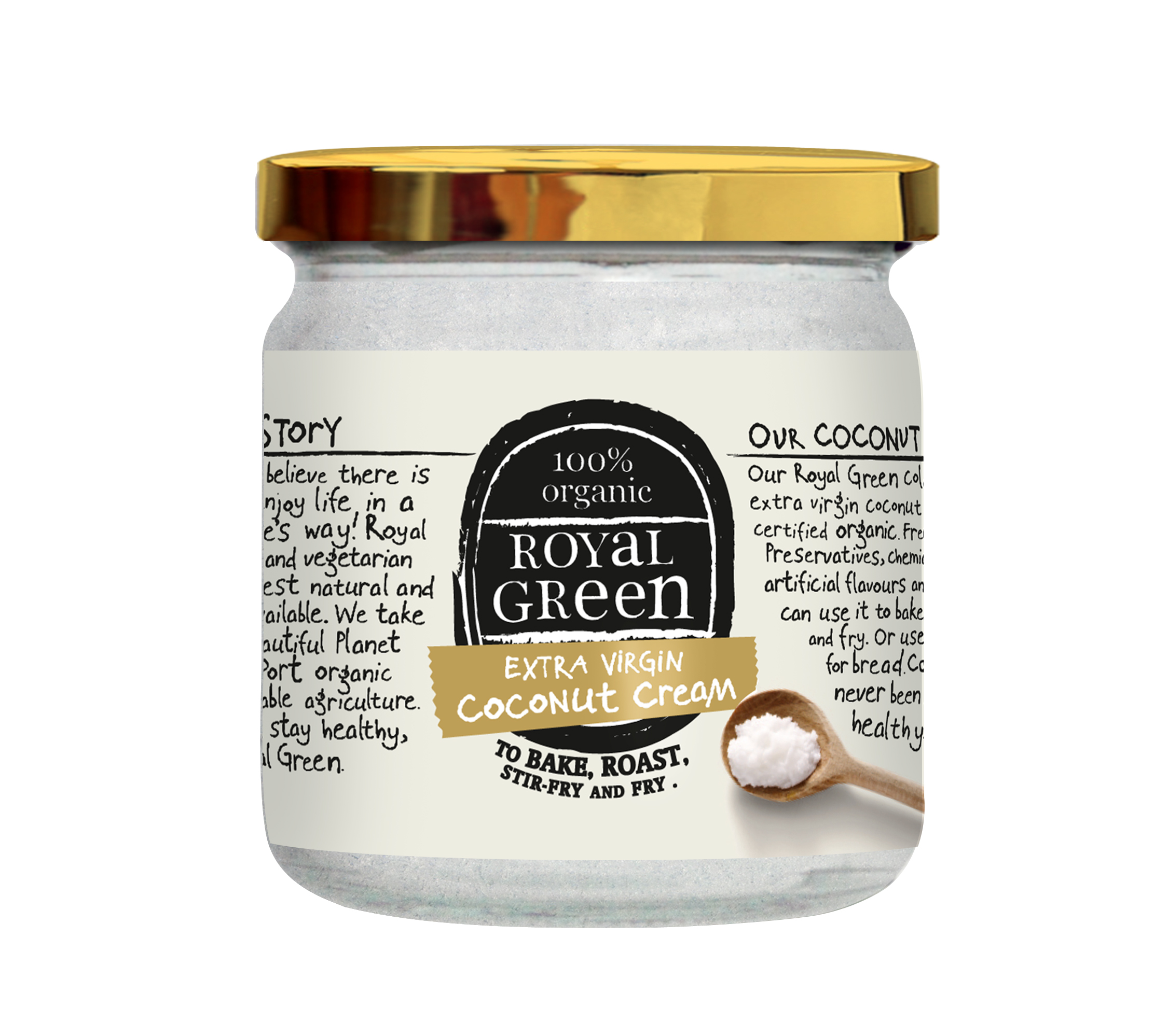 En tot slot: de Royal Green extra virgin kokosolie. Deze is 100% raw (koudgeperst), daarom heeft hij een fluweelzachte kokossmaak.