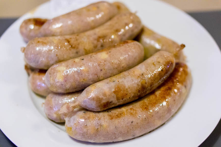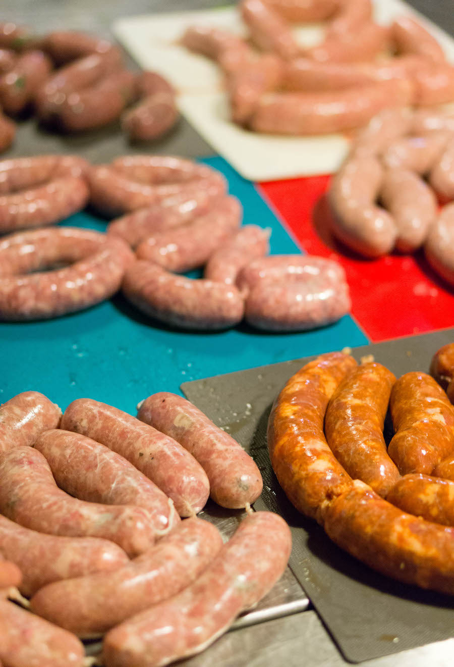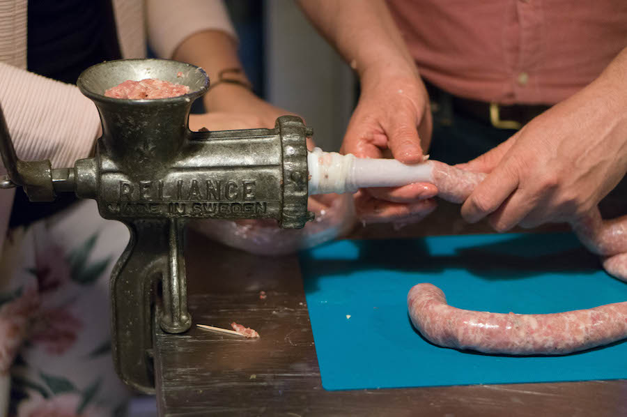 Hoe gaat zo’n workshop van Meneer? De deelnemers vormen zelf groepjes. En elk groepje maakt een andere soort worst (die je later ook állemaal mag proeven – maar daarover straks meer). Dat gaat van de klassieke verse venkelworst tot appel-pistache-sinaasappel worst, jalapeño kipworst en boudin blanc. En voor wie durft: chorizo. Want die is nét even wat moeilijker te maken dan andere verse worst.