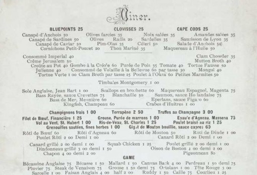 Hoewel het menu er misschien compleet anders uitziet dan wat we vandaag de dag gewend zijn, is er qua gerechten niet eens zo gek veel veranderd. Het menu wat je hier ziet is verdeeld in soepen, salades, zeevruchten, vlees, wild, een dikgedrukt gedeelte waar alle duurdere gerechten vermeld staan, groenten, kaas, fruit en een heleboel desserts.