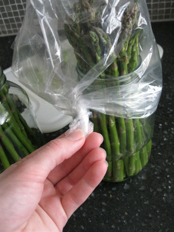 Bedek met een stevig plastic zakje, maar zorg dat het zo min mogelijk asperges aanraakt. Sluit goed af en zet in de koelkast tot je ze weer nodig hebt voor bijvoorbeeld een heerlijke quiche of romige risotto.