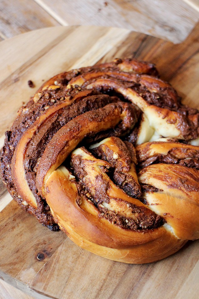 Dit homemade gevlochten Nutella brood met kaneel en hazelnoten zou ook niet misstaan op een feestelijke ontbijttafel.