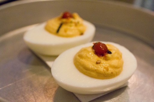 Deviled eggs, ofwel ‘duivelse’ eieren, zijn gevuld met een pittig mengsel met onder andere eigeel. Susan Feniger van Border Grill en Mud Tavern gebruiken de saus om de vulling op smaak te brengen.