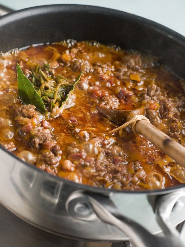 Uitzondering op deze regel is gehakt in tomatensaus. Omdat gehakt van zichzelf niet al te veel smaak heeft, bakken we dit mee met de kruiden en gaan we vanaf daar verder met de saus.