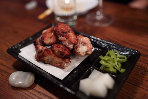 Voor de chicken wings maakt de chef een marinade van sojasaus, mirin en sake. Vervolgens wordt de kip gegrild, niet gefrituurd.