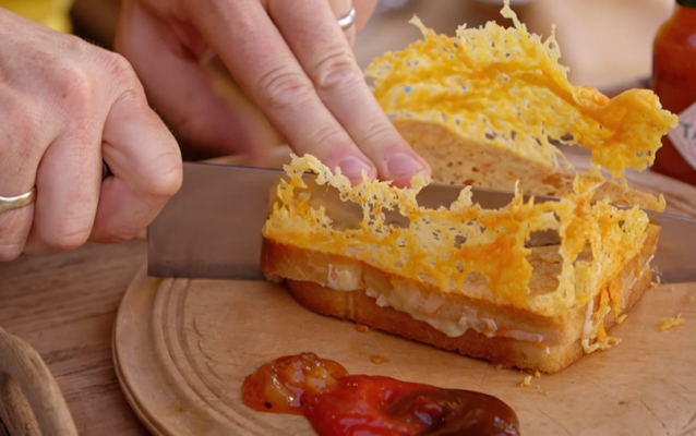 Allereerst: beboter alle kanten van het brood met boter. En doe dit royaal! Dit zorgt voor het heerlijke goudbruine korstje. Voor de vulling gebruikt hij een mix van kazen, waaronder goede Britse cheddar. Hij raspt deze zelf met een grove rasp.