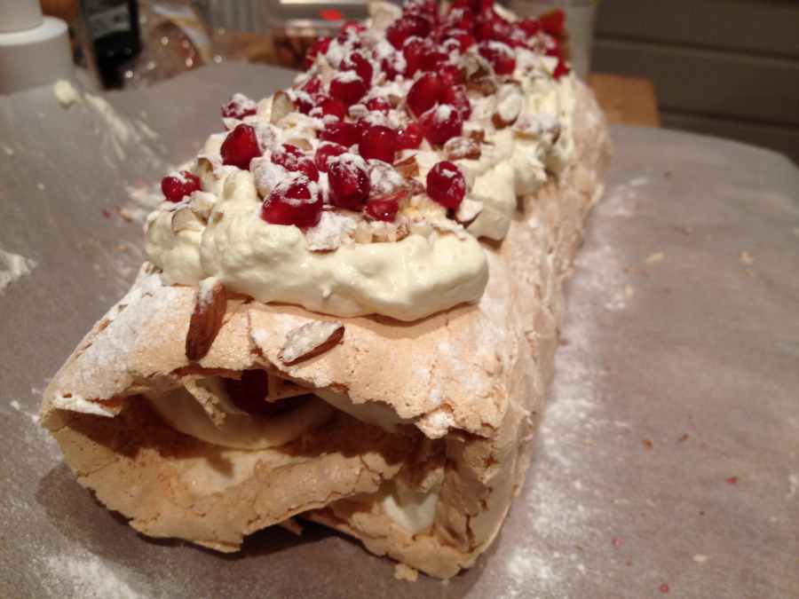 Wij gebruikten frambozen, granaatappelpitjes en hazelnootjes, maar je kunt dit vervangen naar verschillende fruit- en nootsoorten naar keus. Let wel op dat het fruit niet te nat is, zoals bijvoorbeeld sinaasappel. Ook is het lekker om een paar eetlepels lemon curd door de room te mengen. Zo krijg je een heerlijk contrast tussen de zoete meringue en de vulling.