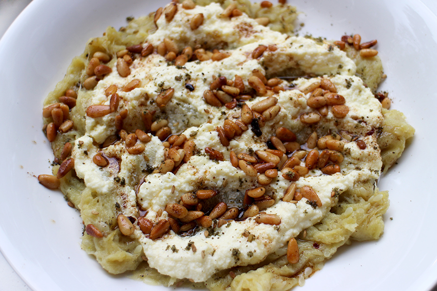 Begin de avond met lekker flatbread (zelfgemaakt of bij een Arabische supermarkt of bakker gekocht). Daarbij serveer je uiteraard Ottolenghi’s klassieke hummus. Deze maakt hij met gedroogde kikkererwten, baking soda, tahinpasta ( te koop bij natuurwinkels en sommige supermarkten), citroensap, knoflook en een snuf zout.